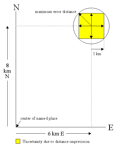 error distance. If the geographic center of the named place is not within
