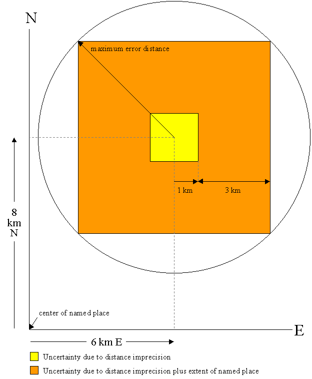 The judgment itself must be documented in the remarks for the determination (e.g., "Assumed 'by air' - no roads E out of Yuma", or "Assumed 'by road' on Hwy. 80"). If there is no clear best choice, use the midpoint between the two possibilities as the geographic coordinate and assign an error large enough to encompass the coordinates and uncertainties of both methods. In this case, the remark should be something like "Error encompasses both distance by air and distance by road (Hwy. 80)".